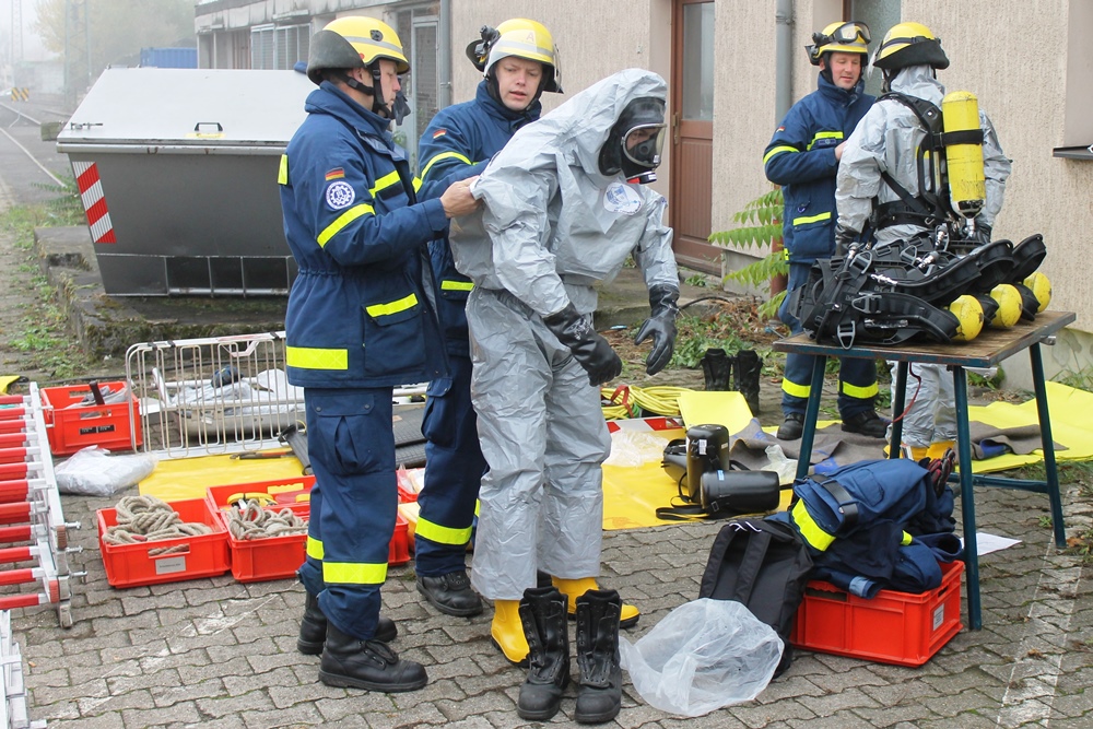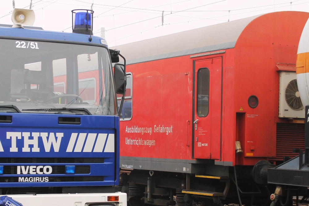 Zum ersten Mal hatten wir die Möglichkeit, an einem Gefahrgut-Seminar der Deutschen Bahn teilzunehmen. Dazu sind 9 Helfer mit dem Gerätekraftwagen nach Hanau gefahren. Auf deutschen Schienen werden jährlich 66 Millionen Tonnen Gefahrgut befördert. Um Rettungskräfte auf Unfallszenarien vorzubereiten, betreibt die Bahn einen Übungszug, bestehend aus Unterrichtswagen, Armaturenkesselwagen und Leckagekesselwagen, der verschiedene Standorte anfährt. Termine sind begehrt, der Übungszug ist mindestens drei Jahre ausgebucht.