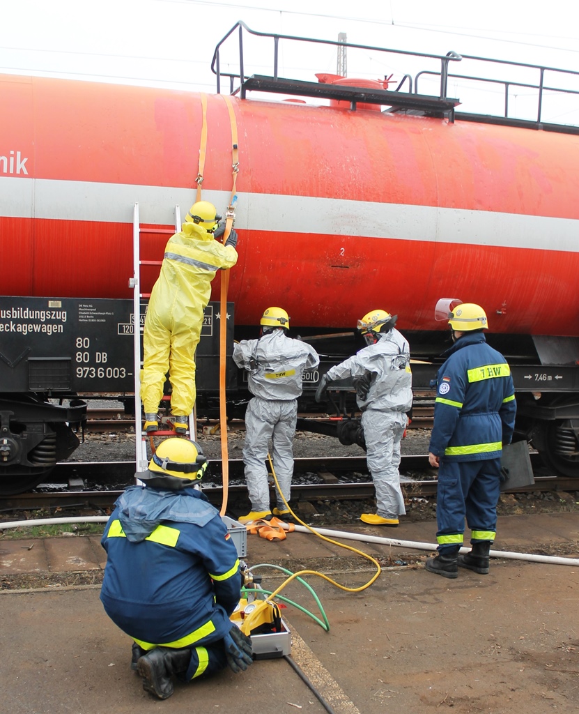 Uns wurde gezeigt, welche Typen von Befüllvorrichtungen es gibt und auf was man bei diesen achten muss (Belüftungsventil oder Sicherheitseinrichtungen). Die Kennzeichnung der Kesselwagen (orange Bauchbinde für Gasdruckwaggons, Un-Nummer) war ein weiteres Thema. Der Übungswagen ist begehbar, innen sind weitere Ventile und Besonderheiten dargestellt. Hier wurde auch erklärt, warum in einem leeren, aber nicht gereinigten Wagen noch bis zu 1000 Liter Gefahrgut sein können (aufgrund der Konstruktion der Ventile). In der praktischen Ausbildung konnten wir an dem Leckagewagen unter Atemschutz und mit Chemikalienschutzanzug üben, wie Löcher mit Holzkeilen oder Hebekissen sowie dem speziellen Leckdichtkissen abzudichten sind.