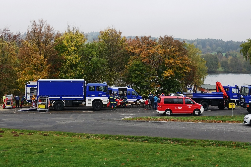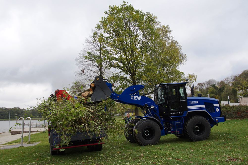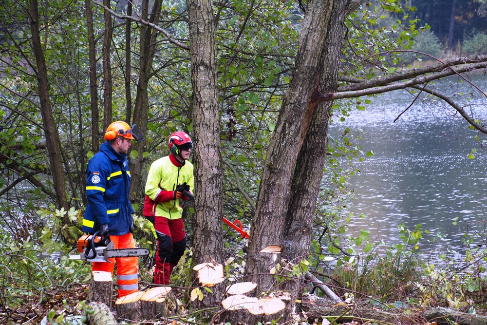 Am Heisterberger Weiher hatten wir die Möglichkeit, für die drei Module entsprechende Bäume zu fällen und aufzuarbeiten. Es war alles dabei von Schwachholz bis Stämme mit 90 cm Durchmesser, außerdem sehr schräg gewachsene und somit schwierig zu fällende Bäume. Das zerkleinerte Holz sollte zum späteren Schreddern auf einem Parkplatz gesammelt werden. Dazu haben wir das Material mit dem neuen Radlader auf zwei Kipper verladen. Das diente gleichzeitig der Ausbildung weiterer Fahrer auf dem neuen Bergungsräumgerät. Insgesamt waren 35 Helfer dabei, mit 9 Motorsägen und 7 Fahrzeugen.