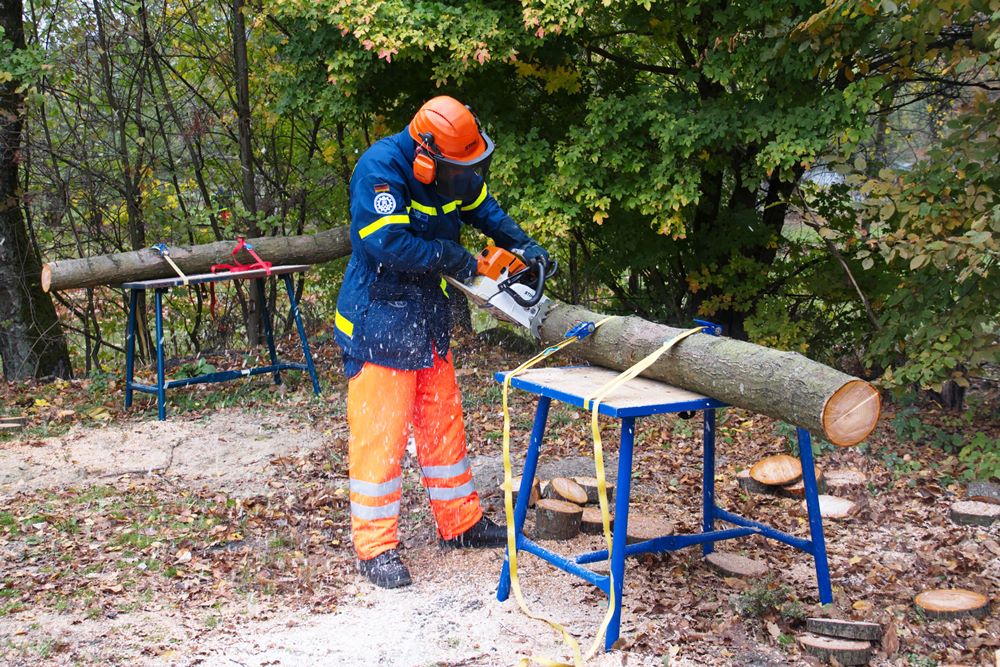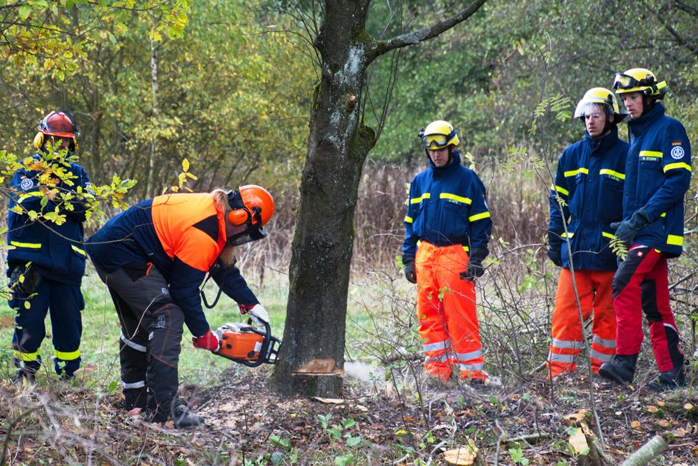 In der Westerwaldgemeinde Driedorf gibt es die Freizeitanlage Heisterberger Weiher. Dort soll ein neues Gaststättengebäude errichtet werden. Dazu müssen am Seeufer Gehölz und Bäume entfernt werden. Für uns ein ideales Übungsgebiet für den realitätsnahen Einsatz von Motorsägen. Die Ausbildung war in zwei Bereiche unterteilt: Grundlagen für neue Gerätebediener und Weiterbildung für Helfer, die bereits eine Motorsägenausbildung haben. Zunächst fand ein theoretischer Unterricht statt, der gleichzeitig für alle die jährliche Belehrung bedeutete.