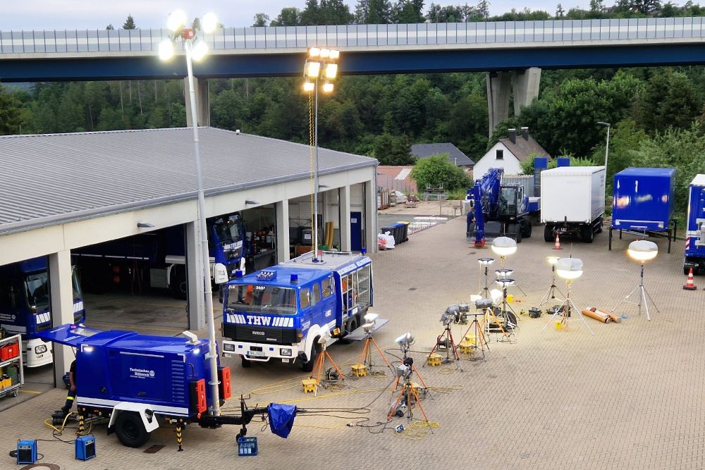 Das Foto zeigt unsere Beleuchtungs-Ausstattung: Reichlich Stative, Kabel, Strahler und Stromerzeuger. Wie das bedient wird lernt man in der Grundausbildung.