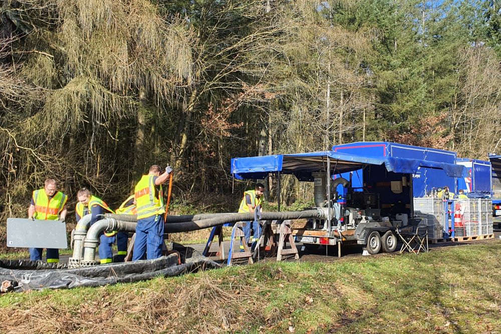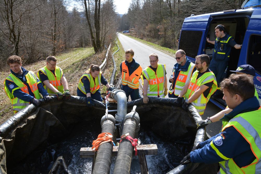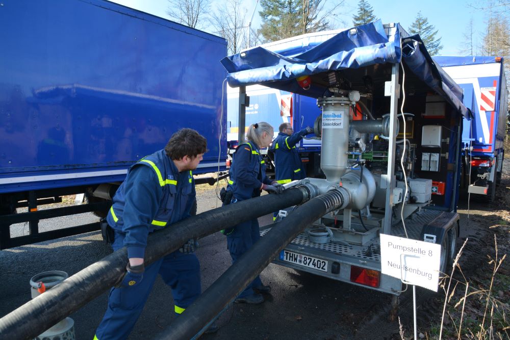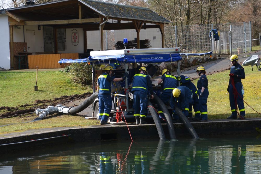 Das THW unterhält Spezialeinheiten für die unterschiedlichen Einsatzzwecke. Eine davon heißt Fachgruppe Wasserschaden/Pumpen. Die zwei wesentlichen Aufgaben sind Pumparbeiten in Hochwassergebieten und der Transport großer Wassermengen über lange Strecken. Jede Einheit verfügt über einen Pumpenanhänger, es gibt zwei Leistungsklassen, mit denen man 300.000 Liter oder 900.000 Liter pro Stunde wegschaffen kann.