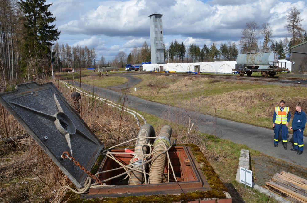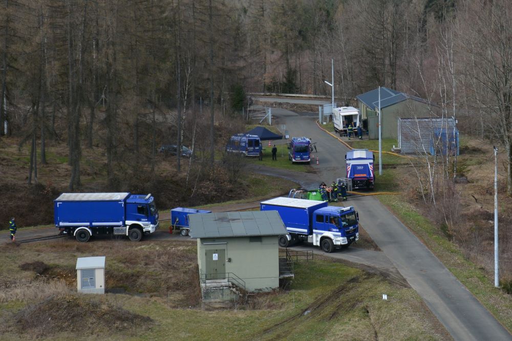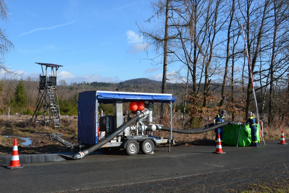 Bei der vom THW Landesverband ausgerichteten Übung musste nicht nur eine lange Pumpstrecke aufgebaut werden, sondern das Wasser auch über eine beachtliche Höhendifferenz gefördert werden. Vom Entnahmepunkt Badeweiher bis zum Ziel auf dem Katastrophenschutz-Übungszentrum (ehemaliges Bundeswehr-Depot) betrug die Distanz 2,9 Kilometer und der Höhenunterschied 165 Meter. Aus technischen Gründen können die Schläuche nicht direkt zwischen zwei Großpumpen verlegt werden. Es muss immer ein Übergabebehälter (4000 Liter) aufgebaut werden, aus dem dann die nächste Pumpe das Wasser ansaugt.