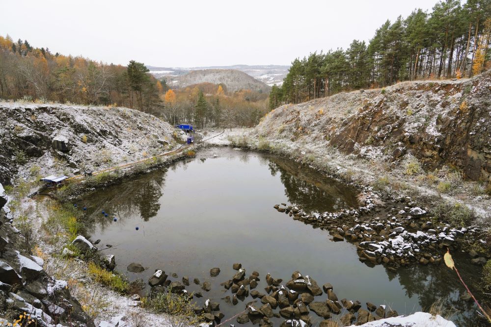 Mit einem Amtshilfeersuchen wandte sich das Regierungspräsidium an das Technische Hilfswerk. Auftrag: Steinbruchweiher in Herborn-Uckersdorf abpumpen. Am Mittwochmorgen (21. November) begann der gemeinsame Arbeitseinsatz von zwei Ortsverbänden. THW Wetzlar stellt die Pumpenleistung, THW Dillenburg die Logistik drumherum. Der Anhänger mit Schmutzwasserpumpe (Leistung 15.000 l/min) konnte mittags in Betrieb genommen werden. Zuvor mussten 90 Tonnen Schotter für die Zuwegung bis zur Wasserlinie angefahren und mit dem Radlader ausgebracht werden.