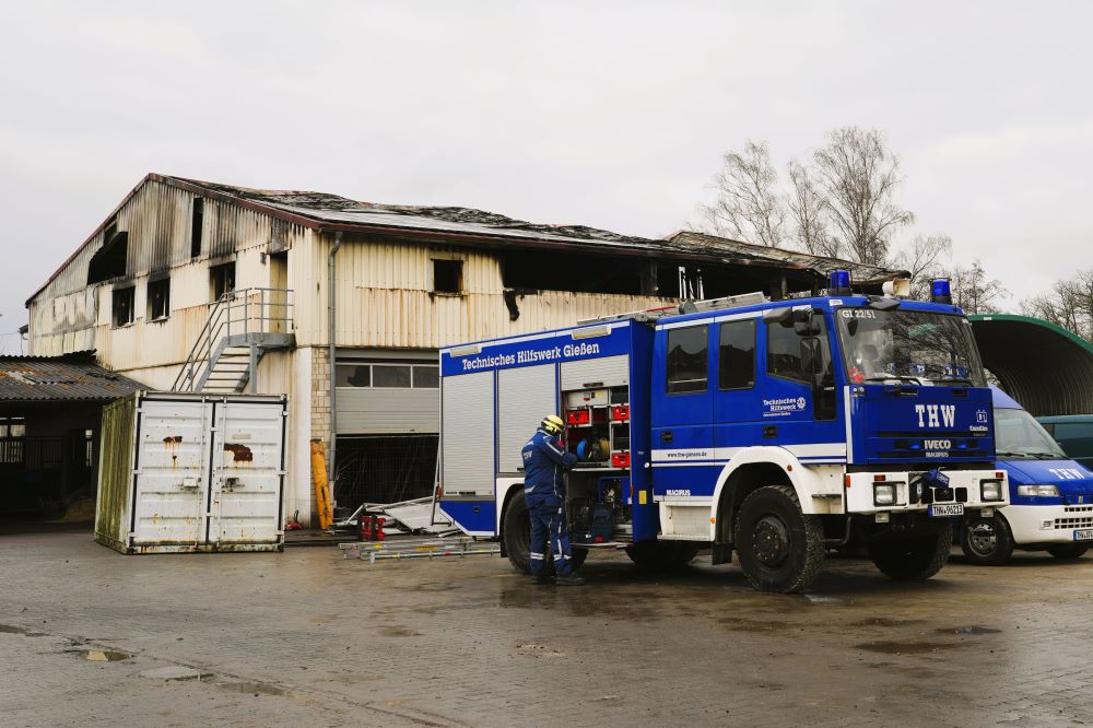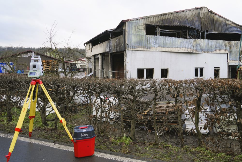 Um die ausgebrannte Lagerhalle gefahrlos betreten zu können, hatte eine Bergungsgruppe des THW Gießen am Mittwoch (22. Januar) bereits Sicherungsarbeiten ausgeführt, um einsturzgefährdete Bauwerksteile zu stabilisieren. Diese Arbeiten hat der ESS-Trupp des THW Dillenburg überwacht. Dabei ist erstmals unter realen Einsatzbedingungen mit dem neuen Einsatzstellensicherungssystem (ESS) gearbeitet worden. Mit dem ESS könnten per Laserstrahl permanent millimetergenau Bewegungen der Bauwerksstruktur überwacht werden. Dazu wird ein Tachymeter verwendet, bekannt von Vermessungsarbeiten auf Baustellen. Nach den Vorarbeiten durch das THW hat am folgenden Donnerstag der ESS-Trupp auch die Begehung des Brandobjekts durch Kripo und LKA mit seiner Messtechnik begleitet, um bei einer Gefährdung sofort Alarm schlagen zu können