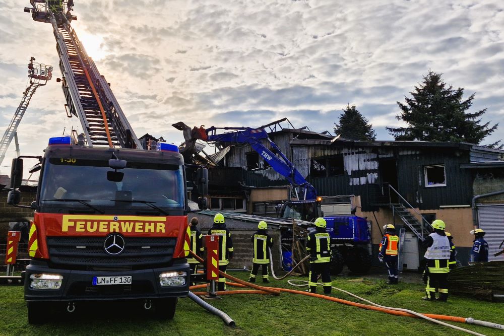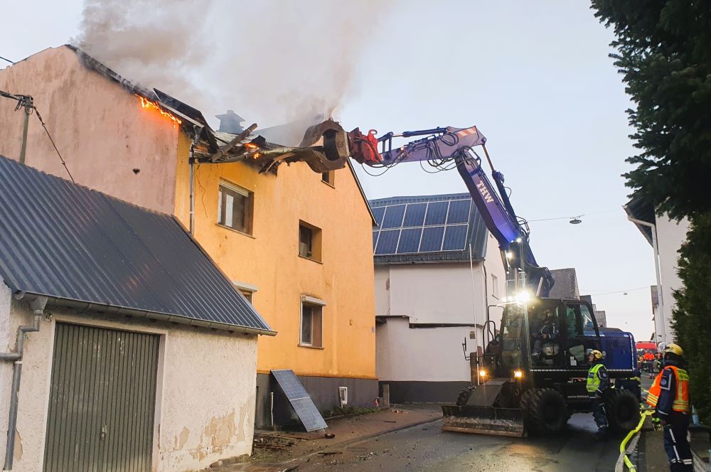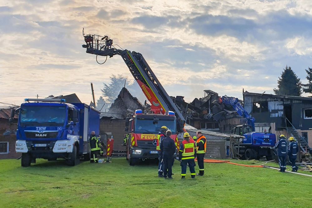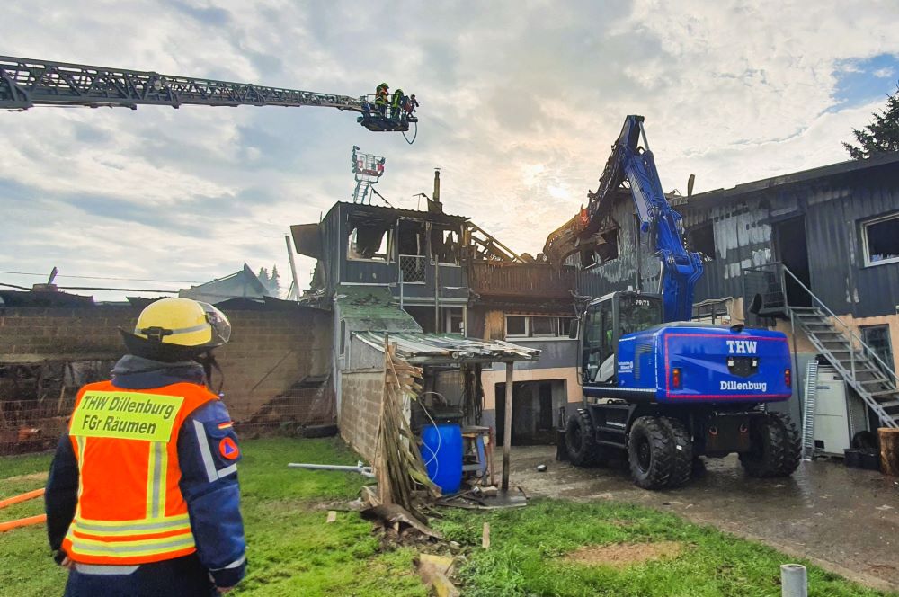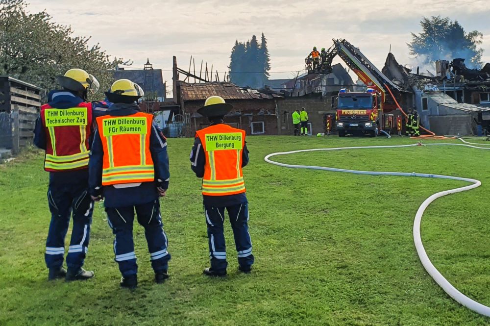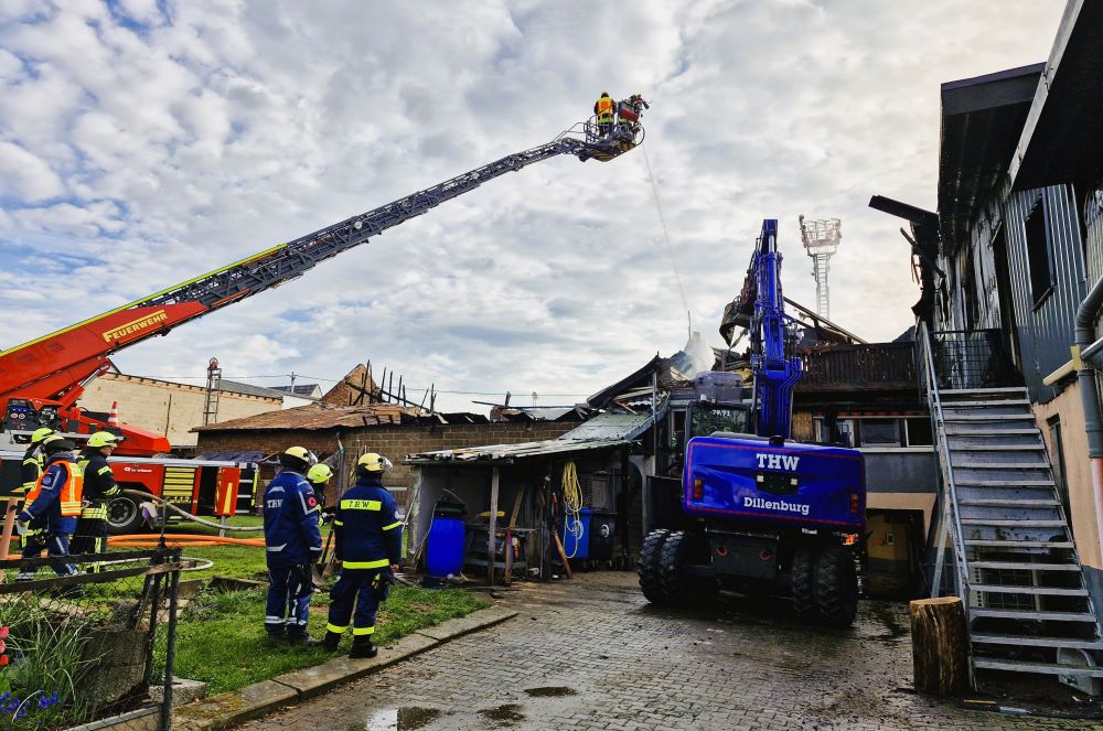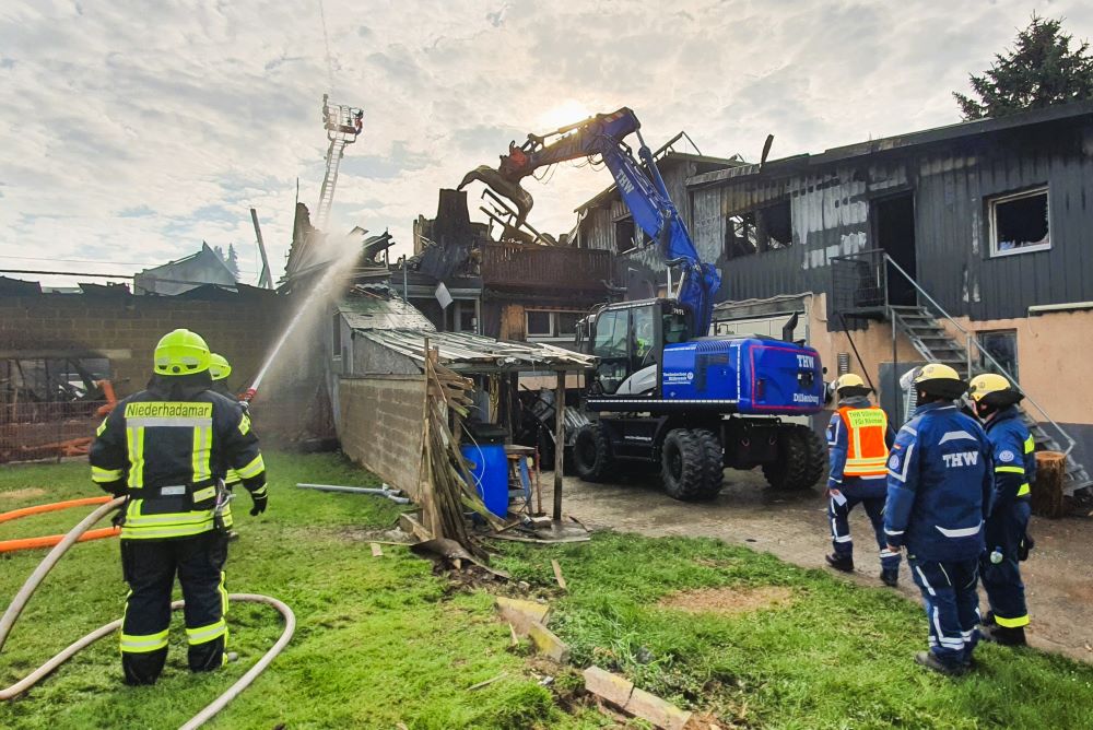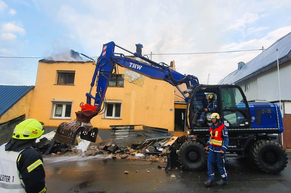 Hadamar. In Niederweyer, dem kleinsten Stadtteil von Hadamar im Landkreis Limburg-Weilburg), hat ein Großbrand zwei Wohnhäuser und eine Scheune zerstört. Zur Unterstützung bei den Löscharbeiten forderte die Feuerwehr beim Technischen Hilfswerk schweres Räumgerät hat. Das THW Dillenburg schickte seinen leistungsstarken Mobilbagger in den Nachbarkreis – zum zweiten Mal bei einem Großbrand innerhalb von vier Tagen.