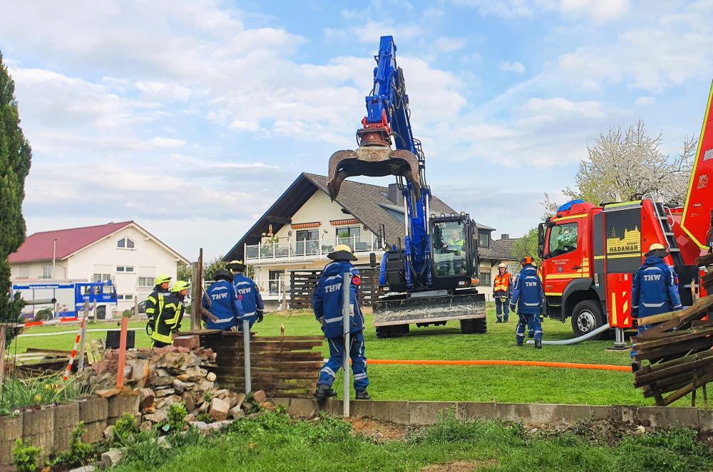 Im Vergleich zum Einsatz vier Tage zuvor in Weilburg waren die Arbeiten in Hadamar technik- und personalintensiver. Vom THW Dillenburg waren 17 Helfer eingebunden, mit Gerätewagen, Kipper, Tiefladesattelzug mit Bagger und Mannschaftstransporter. Unterwegs zur Nachbarschaftshilfe war das Team von 4.00 bis 12.00 gestern Mittag.