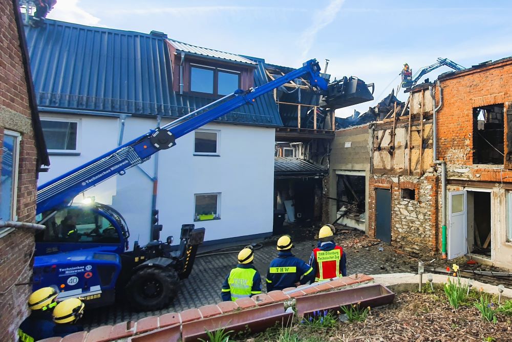 Das THW aus Limburg setzte einen Teleskoplader zur Schuttbeseitigung ein. Der Mobilbagger des THW Dillenburg zeigte mit seinem Greifer erneut, wie vielfältig und effektiv die Baumaschine eingesetzt werden kann. Aufgabe war es, verschiedene Gebäudeteile niederzulegen und Dachflächen zu öffnen, um an Brandnester zu gelangen und die Gefahr von herabstürzenden Teilen zu beseitigen.