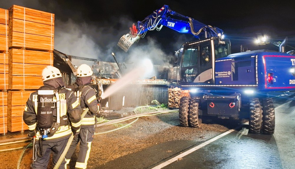 Die Produktionshalle des Sägewerks ist komplett ausgebrannt, gelagerte Bretterstapel gaben dem Feuer reichlich Nahrung. Vor Ort wie tags zuvor die Kameraden des THW Weilburg mit Radlader und des THW Limburg mit Teleskoplader. Die Aufgabenstellung der Einsatzleitung lautete, mit den drei Baumaschinen Dachbleche entfernen und Holzstapel auseinanderziehen, um darunter liegende Glutnester ablöschen zu können. Gezählt wurden 160 Einsatzkräfte, laut Polizei gab es keine Verletzten, aber einen Millionenschaden.