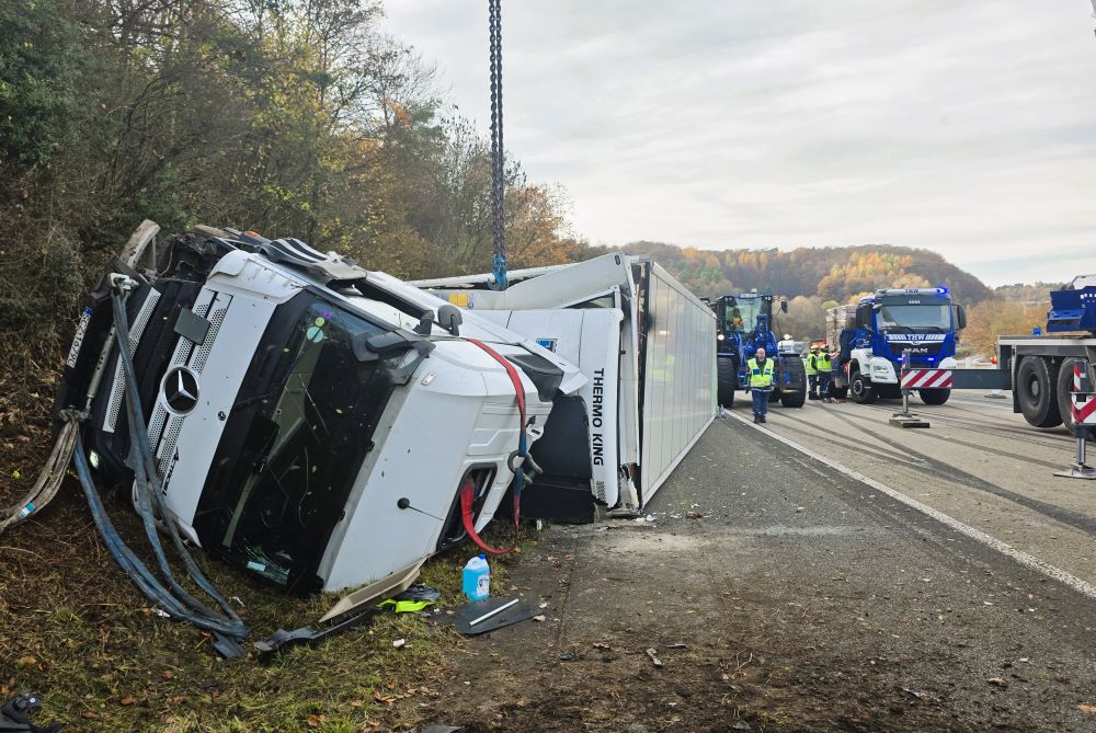 Der 24-jährige Fahrer war am Morgen auf der A45 Dortmund – Gießen Richtung Süden unterwegs. Zwischen der Ausfahrt Dillenburg und der Marbachtalbrücke kam er nach rechts von der Fahrbahn ab. Der Sattelzug fuhr schräg eine Böschung hoch und kippte schließlich nach links auf die Seite. Der Unglücksfahrer zog sich leichte Verletzungen zu. Da in diesem Bereich eine Baustelle ist und zwei der rechten Fahrspuren sowieso gesperrt sind, hatten der Unfall und die Bergungsarbeiten keinen Einfluss auf den Fahrzeugverkehr.
