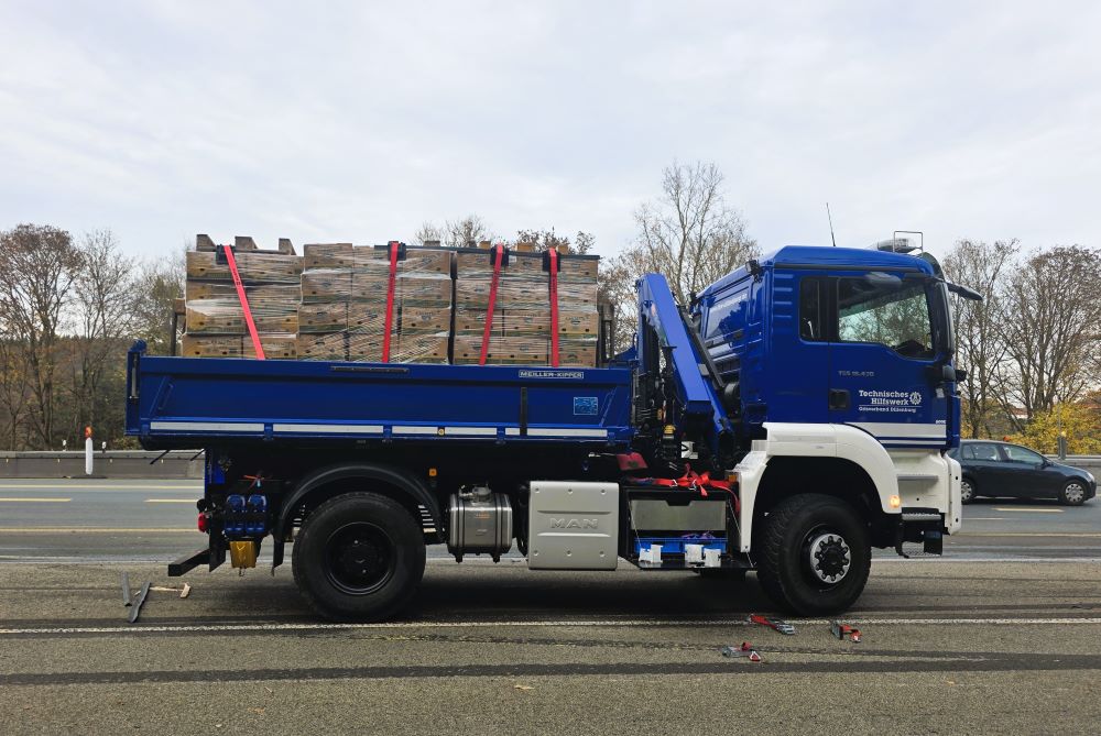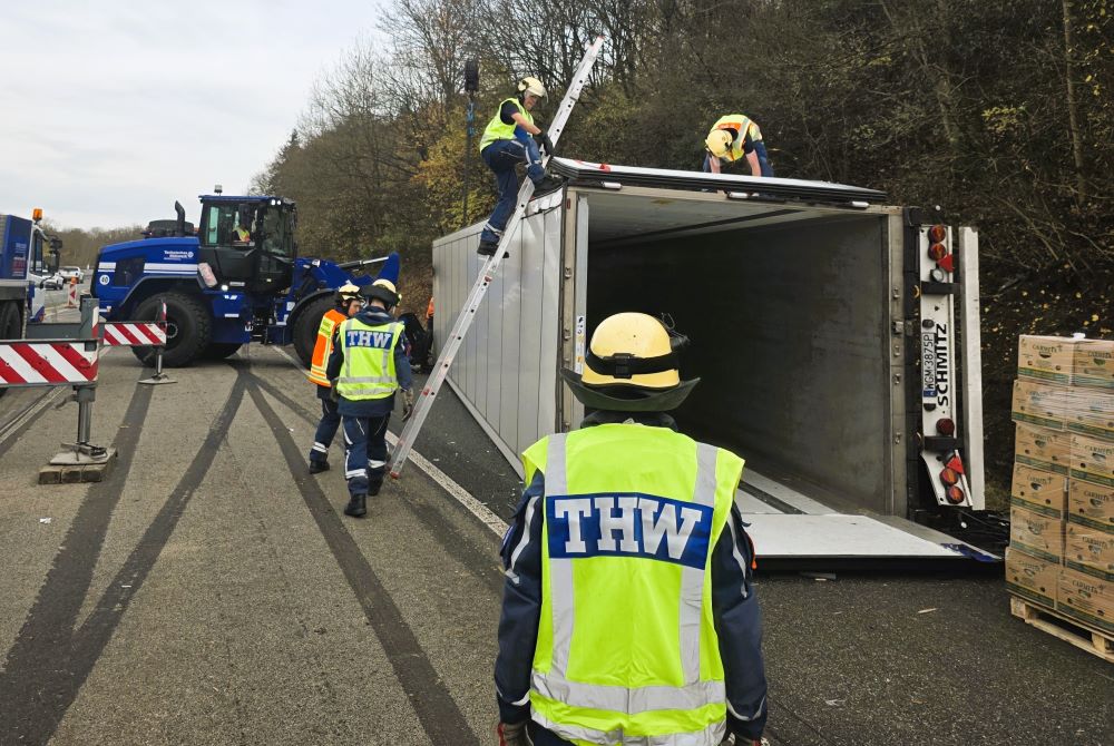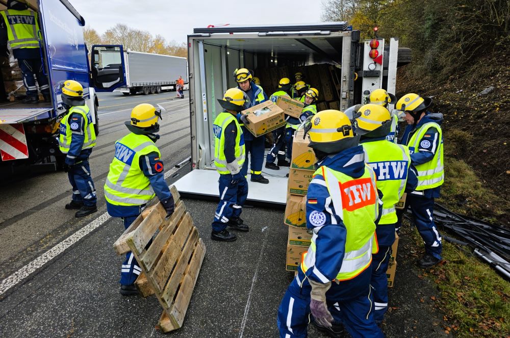 Das angeforderte Bergungsunternehmen konnte den Aufwand, alle 1000 Bananenkartons per Hand aus dem Sattelauflieger zu holen, personell nicht stemmen, sodass mittags das THW hinzugerufen wurde. Die Einsatzkräfte holten die 20 kg schweren Kartons einzeln nach dem Prinzip Sandsackkette aus dem Unfallfahrzeug und stapelten sie auf Paletten. Der Radlader hievte diese dann auf unsere LKW, denn das THW war neben der Bergung auch mit dem Abtransport beauftragt worden. Mit sechs Transportfahrten gelangten die 20 Tonnen Bananen nach Siegen in eine Lagerhalle. Mit dem Radlader unterstützen wir schließlich noch das Aufrichten des Sattelzugs. Kurz vor Einbruch der Dunkelheit war der Einsatz beendet.